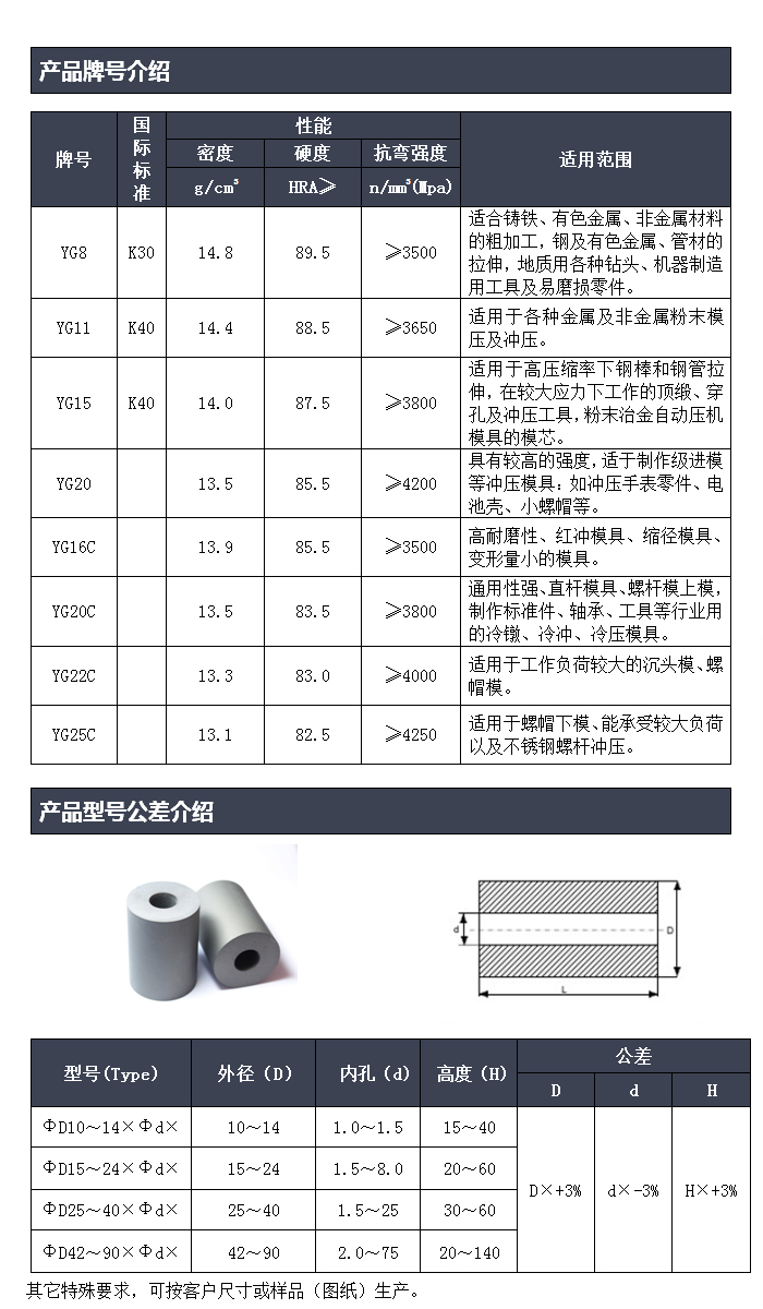 1. 采用含量99.95%高純度原生料碳化鎢粉。 2. 具有較高的耐磨性能及抗沖擊性能。 3. 無損超聲波探傷檢測,無砂眼,無氣孔,材料致密度高。 硬質合金模具(冷沖、冷鐓、冷壓模具)產品主要包括標準螺栓鐓粗模、螺栓鐓縮進模、沉頭頂模、六方螺母冷鐓模、鋼球沖模、電池沖模、六方螺母拼塊模、帶錐直孔沖壓模、外錐直孔沖壓模、硬質合金剝皮模、硬質合金剪刀片、硬質合金拉伸模、硬質合金拉絲模、硬質合金密封環、硬質合金軋輥等。
